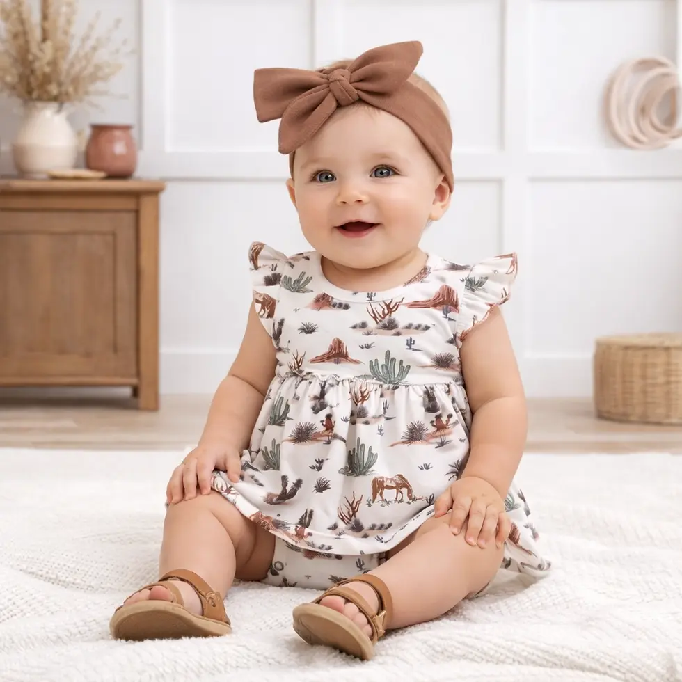 Baby Girl Skirted Bodysuit – Soft Bamboo Cactus Trails